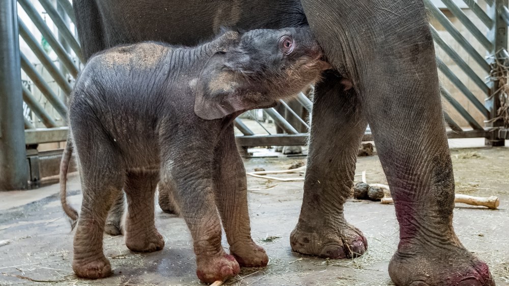 Novorozené slůně se už krátce po porodu pokoušelo napít mléka. Foto: Miroslav Bobek, Zoo Praha.