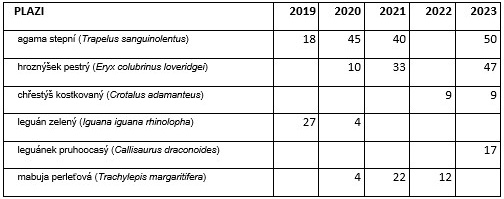 V následujícím přehledu je uveden soupis utracených plazů v letech 2019–2023. Jedná se zejména o krátkověké druhy s rychlou reprodukcí. Chov takových druhů je dlouhodobě udržitelný jen při simulaci obdobných podmínek jako v přírodě, což znamená vysokou nadprodukci mláďat, ze kterých jen některá mají dostatečnou zdatnost na zapojení se do další reprodukce. Druhým případem jsou druhy rodící živá mláďata, jejichž počet není možné regulovat před narozením a zároveň je nemožné pro všechna mláďata následně zajistit odpovídající umístění. Utracení plazi následně slouží jako významná složka potravy pro kriticky ohrožené krasky jávské.