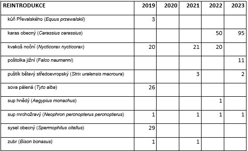 Tab. 3 Počet jedinců daných druhů reintrodukovaných nebo poskytnutých k reintrodukci (abecedně) do volnosti v letech 2019–2023.