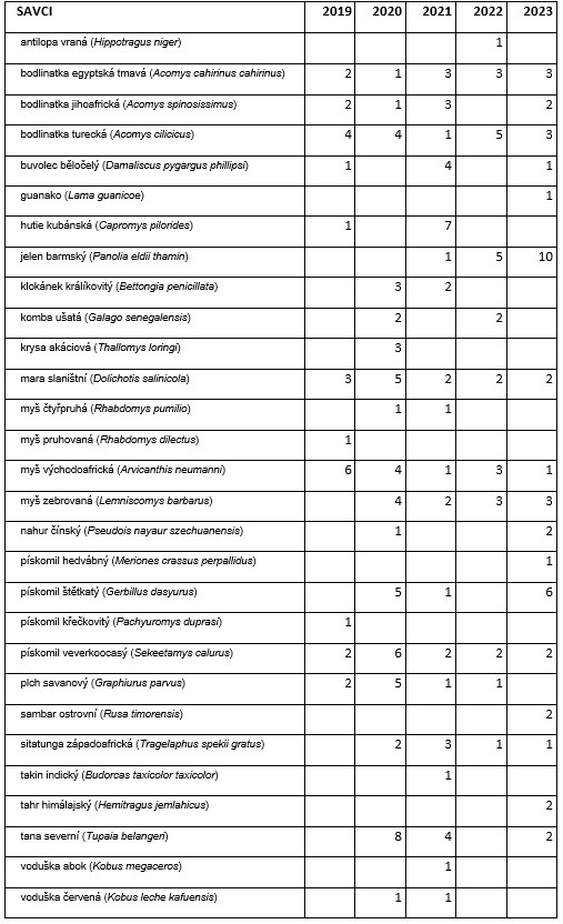 1. Kolik zdravých zvířat ve Vaší zoologické zahradě bylo v letech 2019–2023 (v posledních pěti letech) utraceno z důvodu přespočetnosti (eutanazie v rámci managementu chovu v souladu s příslušnými veterinárními předpisy a EAZA Guidelines)? Prosím o rozepsání druhů a počtů dle jednotlivých let.