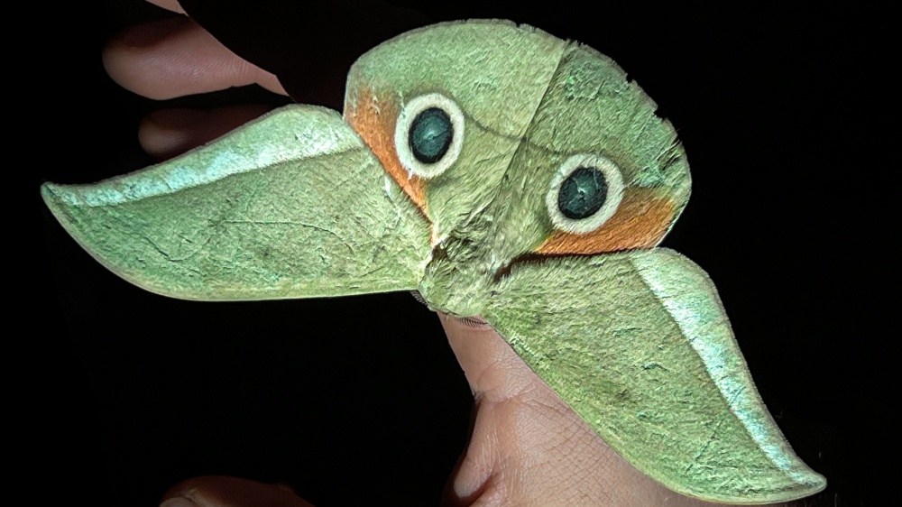 Naší únorové cesty se účastnil i kolega Karel Kodejš. Jeho hlavním úkolem bylo přivézt do nového pavilonu goril v naší zoo velké nosatce Rhynchophorus phoenicis, jejichž larvy patří ve střední Africe k oblíbeným lahůdkám. Karel pochopitelně využil příležitosti a během našeho pobytu na okraji Biosférické rezervace Dja, v Somalomo, svítil po nocích UV světlem, aby na ně přilákal hmyz. A hned jedním z jeho prvních úlovků se stal velký noční motýl s tělem i křídly pokrytými jemňounkými chloupky. Nádherný tvor! Ještě než ho Karel pustil zpět na svobodu, ve světle baterky jsem si ho alespoň mobilem vyfotografoval. Snad i ze snímku je patrné, že vypadal jako ze sametu.