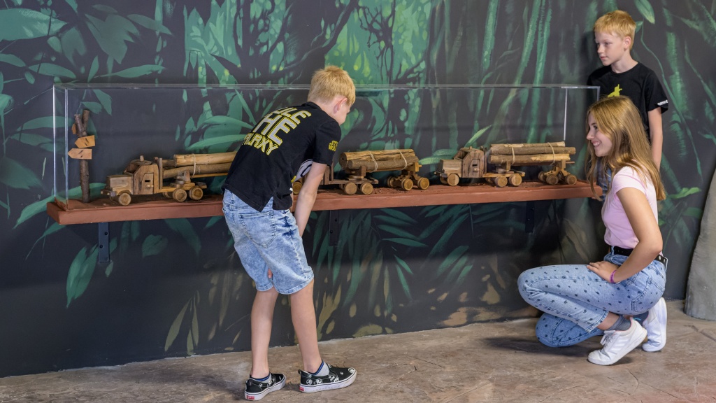 Modely kamionů dovezené přímo z Kamerunu zastupují v pavilonu vozy naložené vytěženým dřevem a symbolizují tak jeden z velkých problémů, kterým čelí tropické deštné lesy. Foto: Petr Hamerník, Zoo Praha