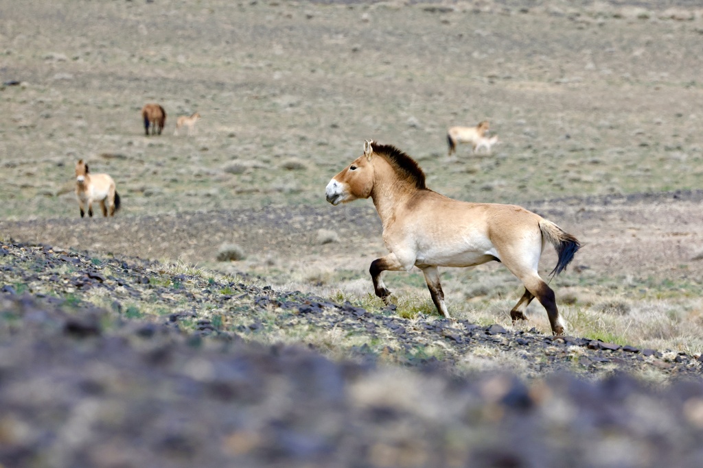 Ganbaatar waved at me insistently and showed me the direction I should take. I quickly set off up the rocky slope and then I saw him. From behalf the horizon, just a few dozen metres from me, a beautiful stallion of Przewalski’s horse silently emerged. He stood facing me, watched me intently, shortly ran towards me and only then he turned and disappeared behind the ridge of the slope. He again reappeared in a moment, and this time I noticed a large harem of his mares behind him. The stallion covered their gradual retreat and during that he showed himself to us again, and once more. He provided me with by far the greatest experience from this year’s journey to the western Mongolia.