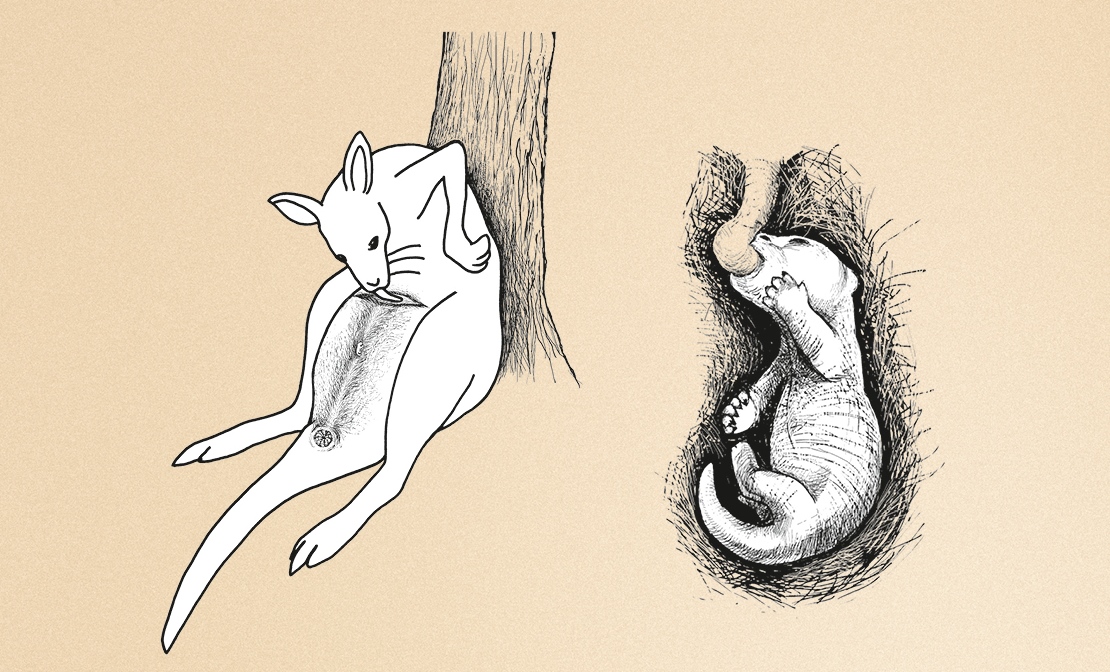 All macropods have a short gestation period – at most 38 days. The new-born baby is tiny and very imperfectly developed; in fact it is only a foetus. Despite this, it has to pull itself up its mother’s belly and into the pouch, find a teat and attach itself firmly. The mother does not help during this. Before giving birth she just thoroughly cleans the pouch and then licks the baby occasionally during its journey, perhaps to protect its translucent thin skin from the sun.