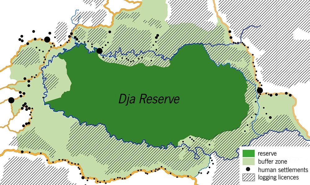 Near the Dja Faunal Reserve, timber harvesting is permitted and logging licences have been granted for most areas surrounding the protected zone. If widespread deforestation were to take place, wildlife populations would become isolated from one another. That is why it is so important not only to protect individual reserves, but also to preserve the corridors that connect them.
