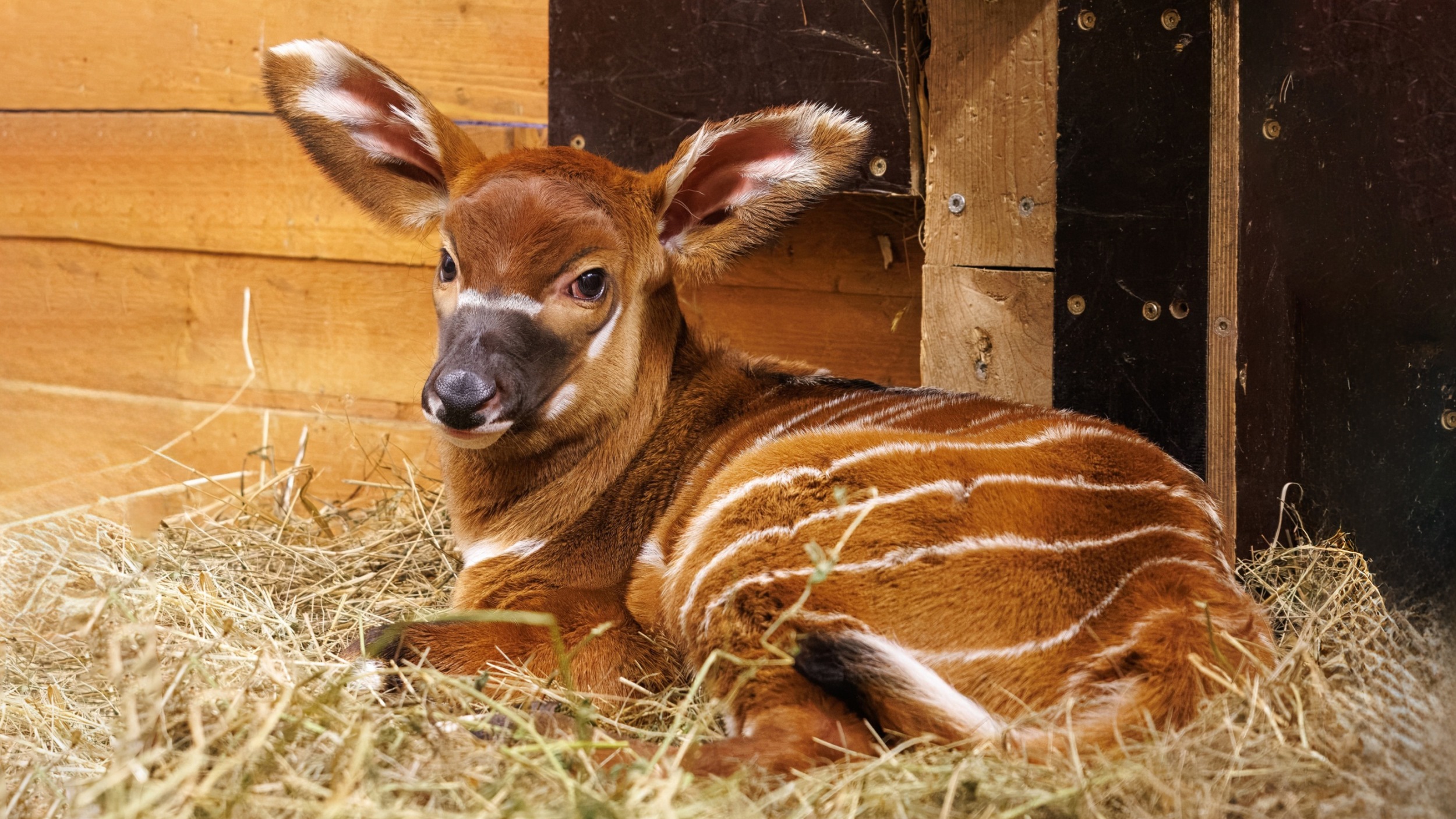 Пестрая каштановая шерсть с белыми полосками и пятнами помогает горным бонго прятаться в густом подлеске. Новорожденный детеныш самки Райли. Фото: Мирослав Бобек, Пражский зоопарк Пестрая каштановая шерсть с белыми полосками и пятнами помогает горным бонго прятаться в густом подлеске. Новорожденный детеныш самки Райли. Фото: Мирослав Бобек, Пражский зоопарк