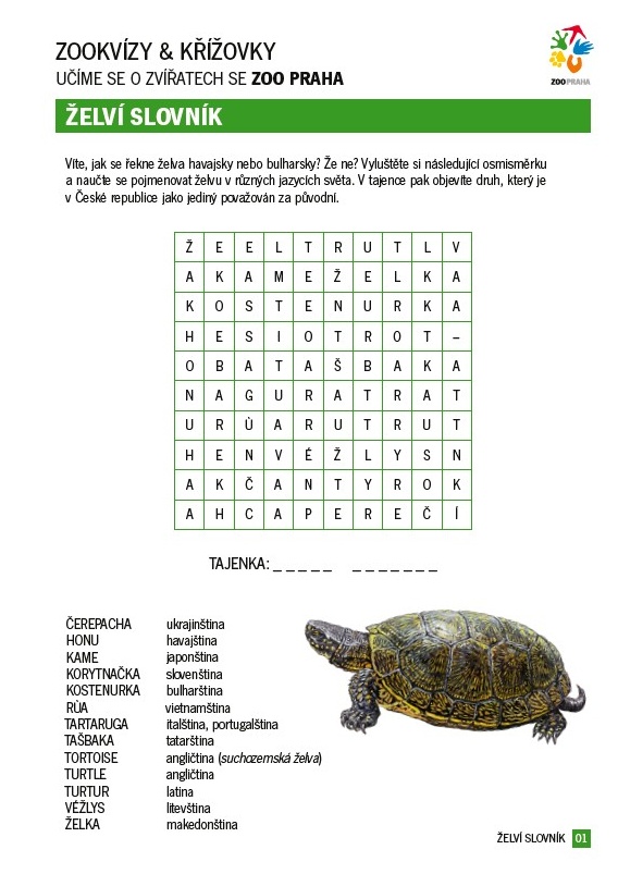 Víte, jak se řekne želva havajsky nebo bulharsky? Že ne? Vyluštěte si následující osmisměrku a naučte se pojmenovat želvu v různých jazycích světa. V tajence pak objevíte druh, který je v České republice jako jediný považován za původní.